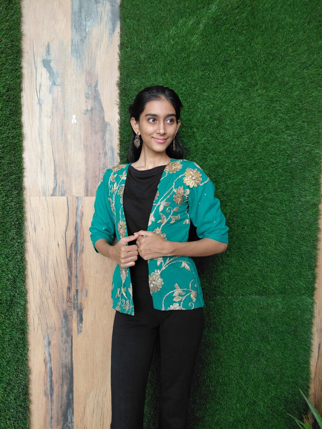 A lightweight georgette jacket adorned with elegant floral threadwork that brings a soft festive charm to your look.