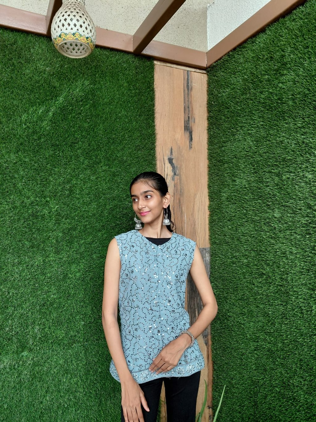 A stunning sleeveless jacket crafted from soft georgette and beautifully embellished with sequin embroidery.