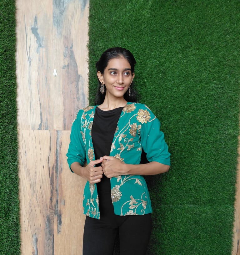 A lightweight georgette jacket adorned with elegant floral threadwork that brings a soft festive charm to your look.
